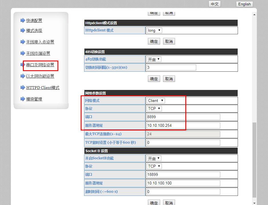 在串口及网络设置,设置串口参数,设置工作模式设置TCP client模式。本地端口8899。