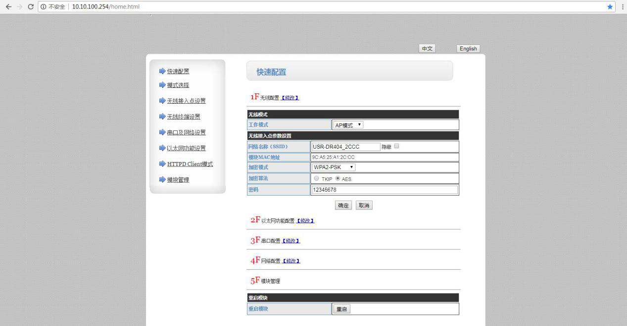 USR-DR404默认IP是10.10.100.254,用这个IP,在浏览器输入,进入USR-DR404的内置网页,可以对DR404进行参数查看和参数配置。登录用户名和密码都是admin。
