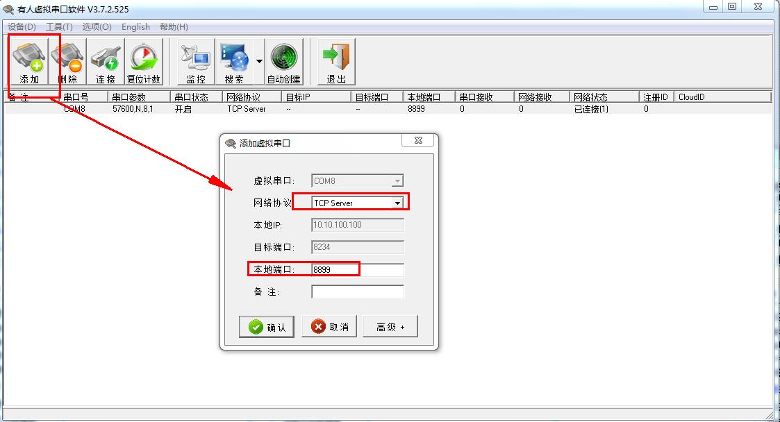 电脑关闭杀毒软件和防火墙,下载并安装虚拟串口软件,手动添加一个COM口,做TCP server,端口8899。