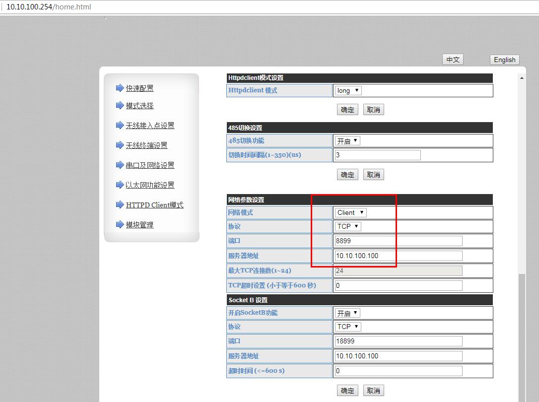DR404在网页上,串口及网络设置,设置网络模式TCP client,服务器IP填电脑IP10.10.100.100,端口填8899。保存参数,重启DR404