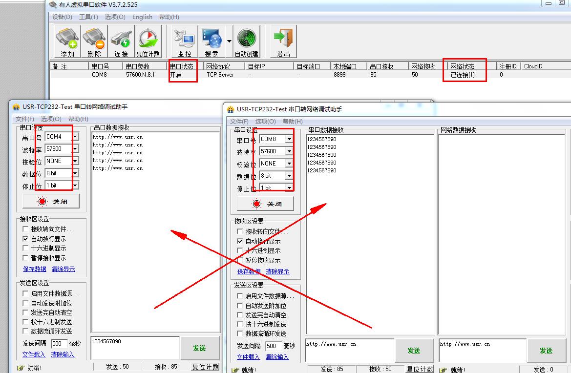 然后用两个USR-TCP232-TEST测试串口和虚拟串口之间的数据传输。