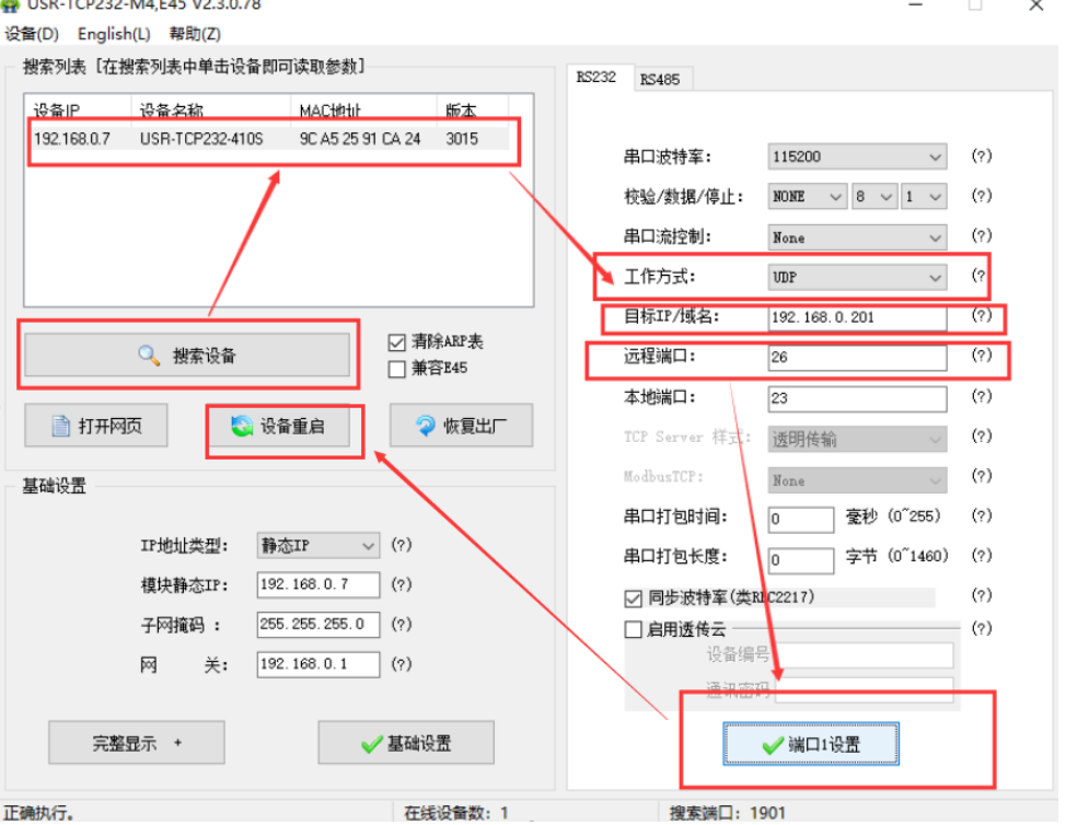 2. 打开设置软件USR-TCP232-M4-setup-V2.3.3.97,选择232的串口进行参数的配置,选中完后,设置相关的参数:工作方式设置为“UDP”,然后将目标的IP为:“192.168.0.201”然后将远程端口设置为“26”.点击端口一设置,然后点击设备重启。