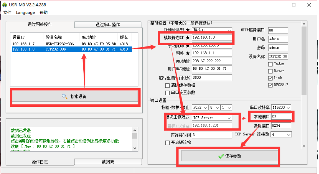 1、连线后打开MO设置软件,点击搜索设备,搜到设备后,点击进行配置,一台306做sever,设置好网口静态ip以及端口,保存参数。(连接同一交换机时静态路由必须与上级路由在同一网段,且ip不能一样)