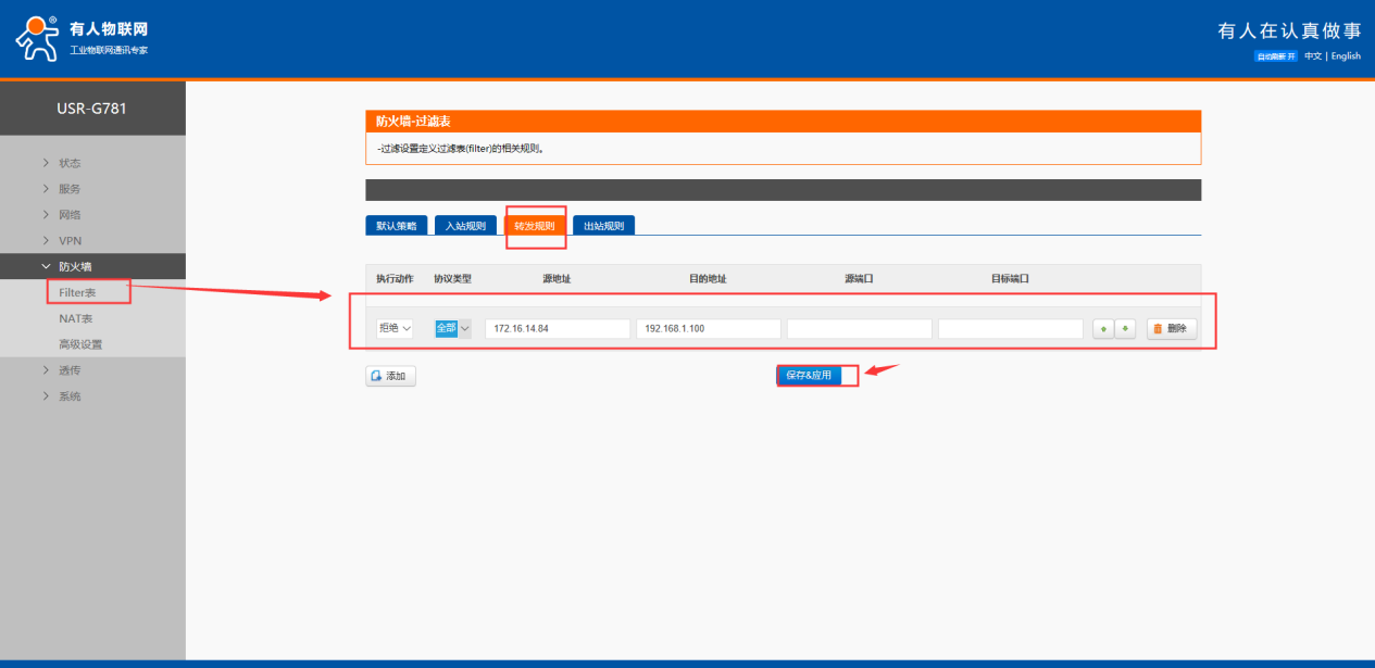 2、设置转发规则,在防火墙---Filter表----转发规则中设置