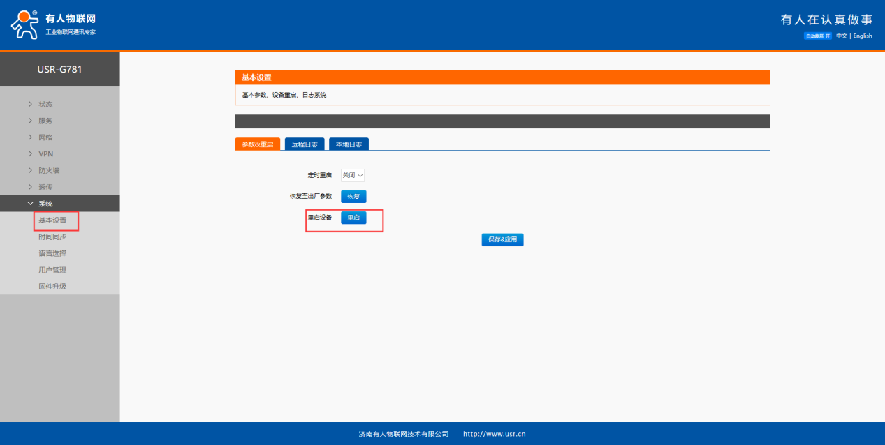 3、设置完成后,在系统---基本设置界面点击重启按钮,重启G781.