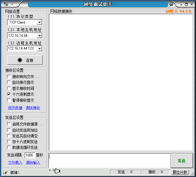 4、在PC2上打开网络调试助手连接PC3,如下图可以正确连接上,并能够和PC3互相首发数据。