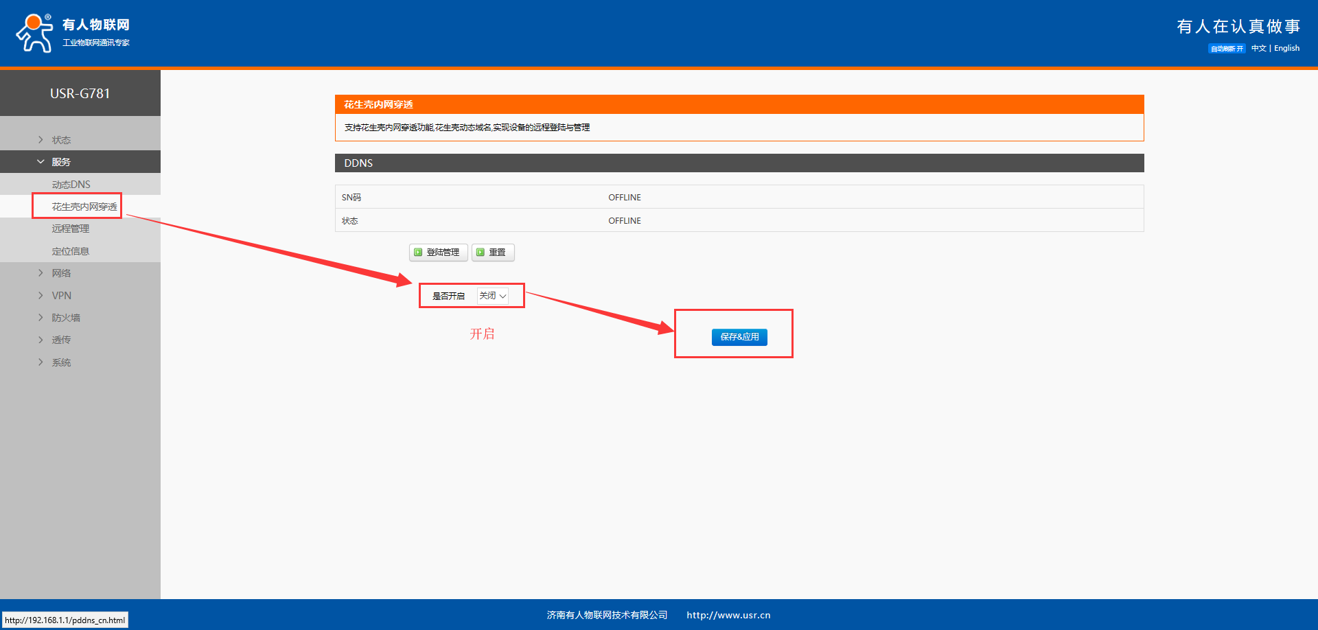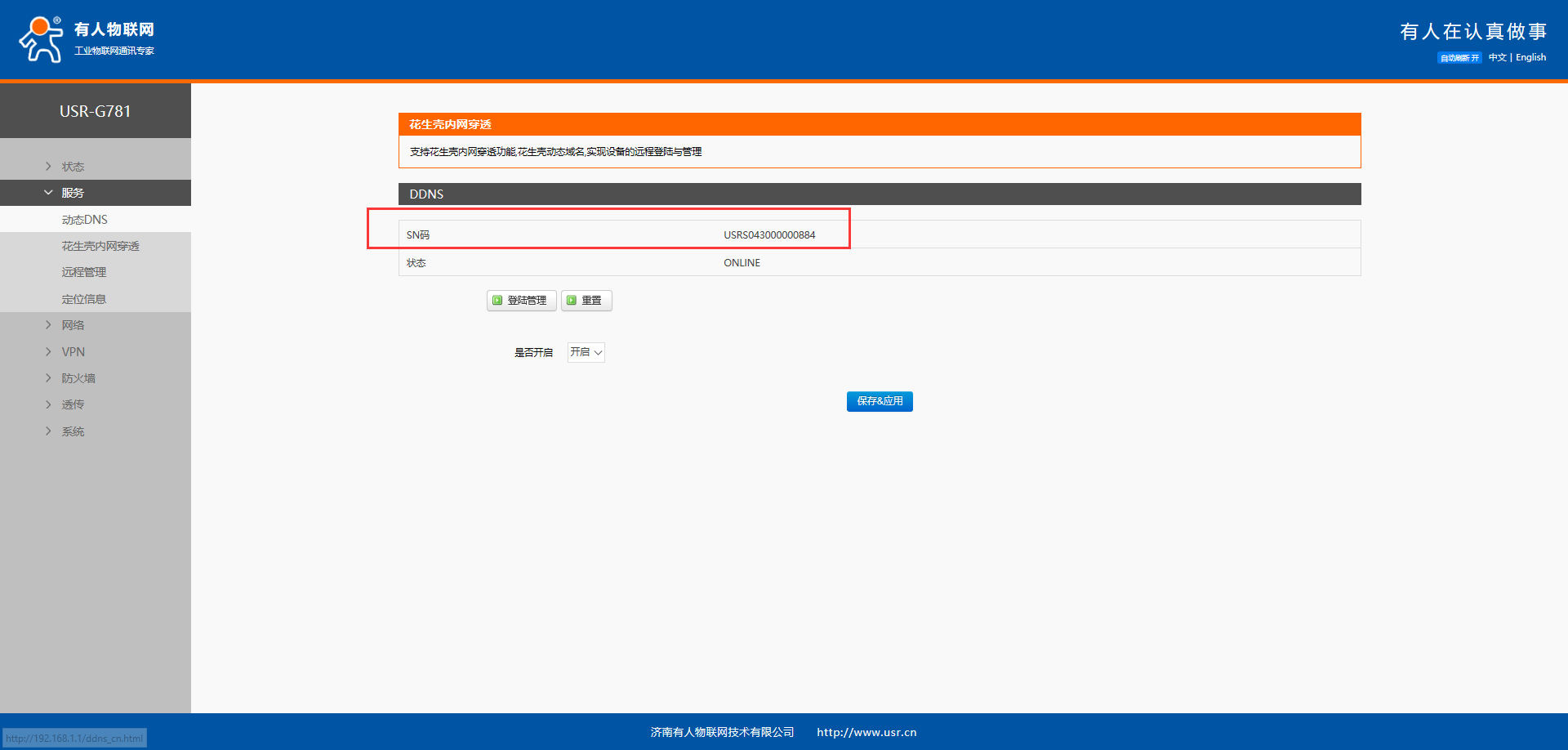 1、 启用花生壳内网穿透功能。选择开启,点击保存&应用,等待数秒,状态会显示ONLINE,并会自动识别到设备的sn码,即成功开启