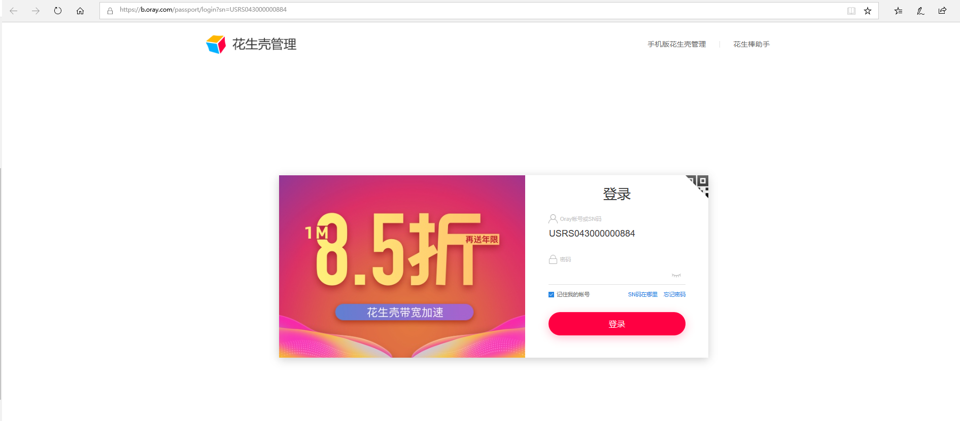 2、点击登陆管理,页面跳转到花生壳登陆页面,自动识别设备sn,默认密码admin。点击登陆。