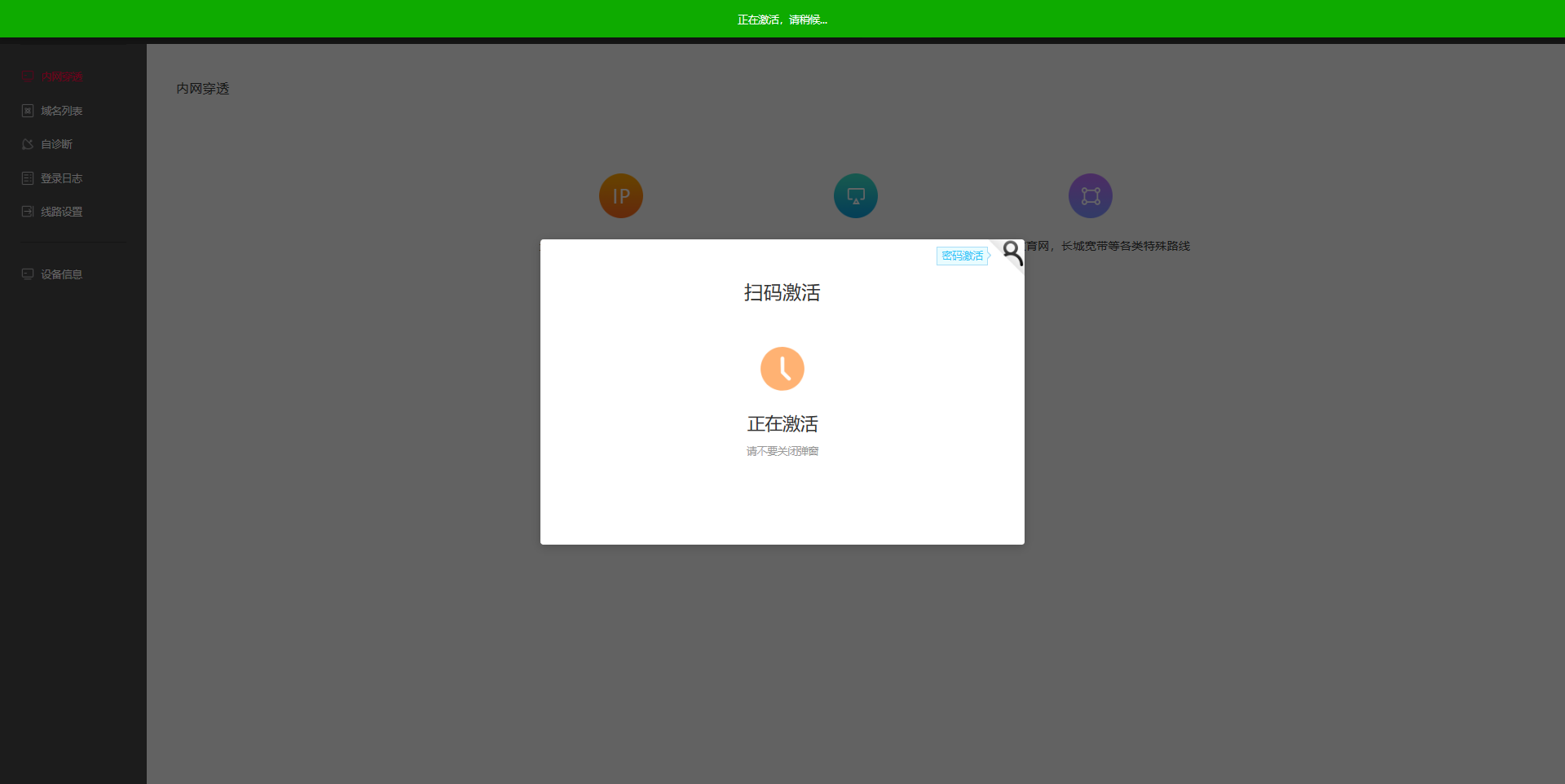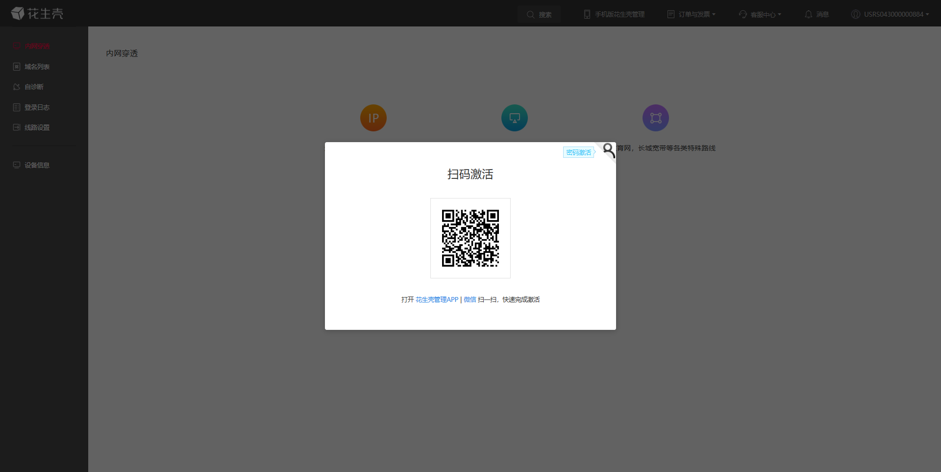 3、进入页面后显示扫码激活。可以用手机花生壳APP扫描二维码激活或者点击右上角,切换激活方式。