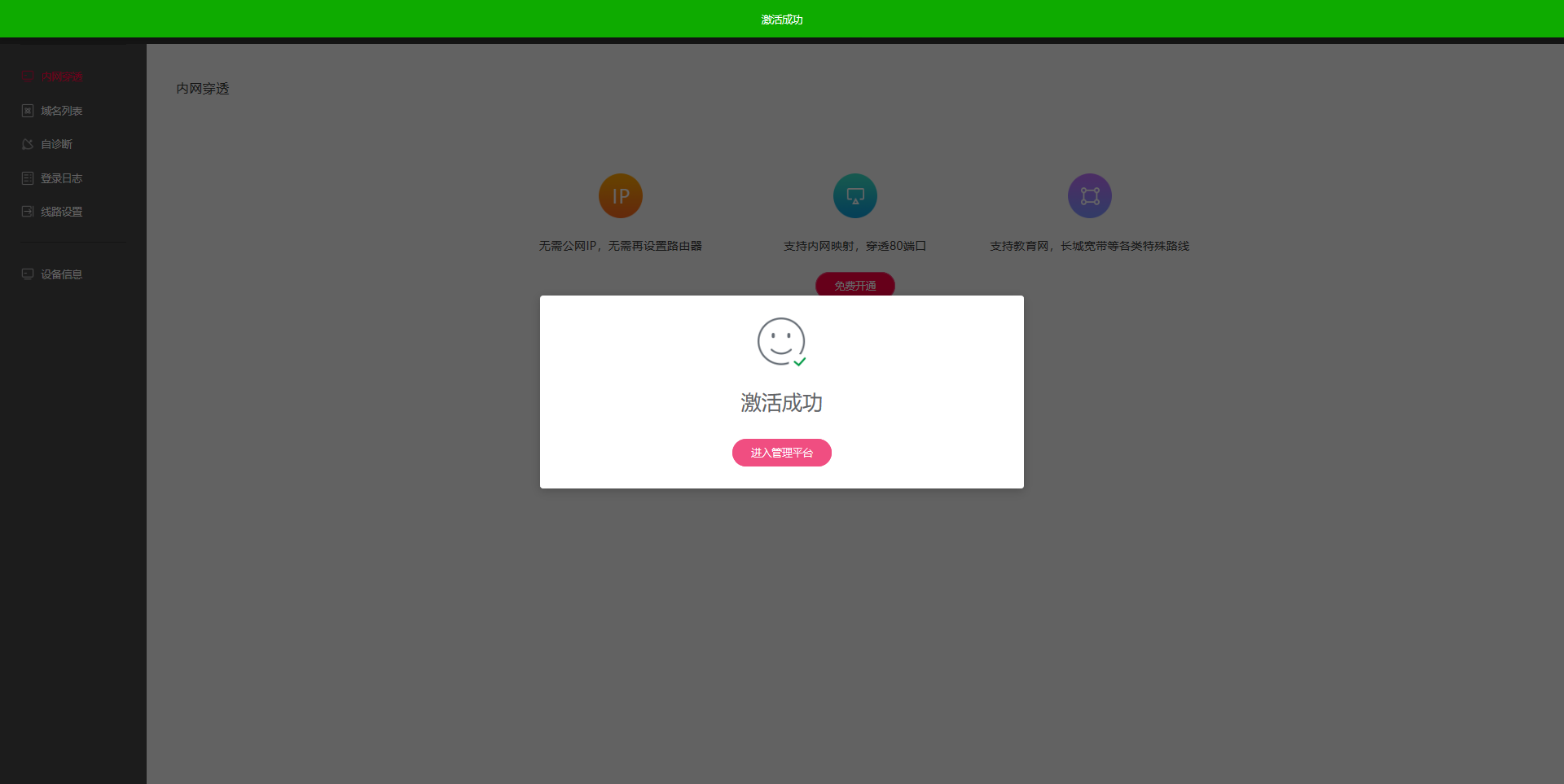 手机端确认激活后,显示激活成功,点击进入管理平台。