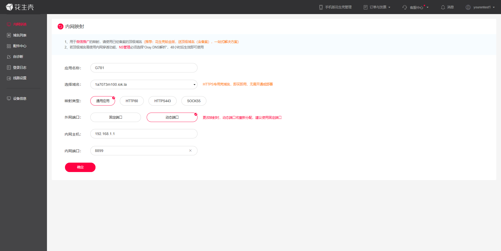 应用名称可以自定义,以便于自己区分。应用图标、应用域名、映射类型、外网端口可以根据自己需求来选择,有些选项是收费的。(具体收费细则可咨询花生壳的相关销售和技术,本功能是第三方应用,我司不对其进行收费等业务办理。)在这里如下设置。内网主机填写路由器的LAN口的IP地址,端口是G781 socketA的监听端口.设置完成后点击确定。