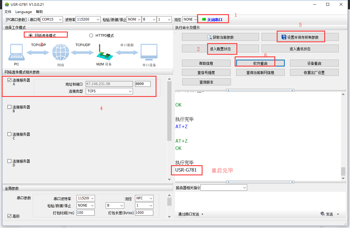 5、通过G781串口设置参数,socketA作为TCPS监听端口