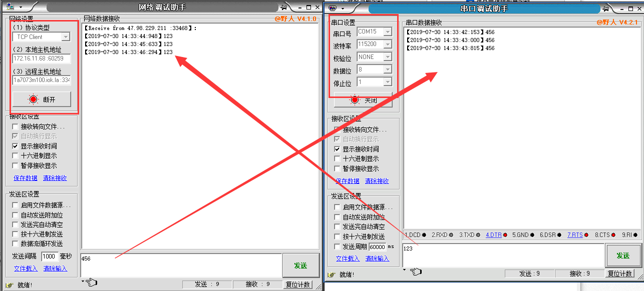 6、在可访问公网的PC上打开调试助手,填写服务器地址和端口(花生壳生成的域名和端口),点击链接,G781的LINKA指示灯亮起;在G781串口链接的PC上打开串口调试助手,在发送区发送数据,可以看到数据的双向通信: