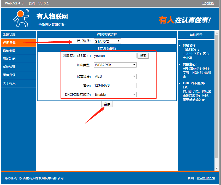 12、内置网页的账号和密码都是admin,进入以后选择模式选择模式选择为sta模式,设置要连接的wifi名称、加密类型、算法、密码,点击保存;(先不要重启,等设置完所有的参数再重启设备)