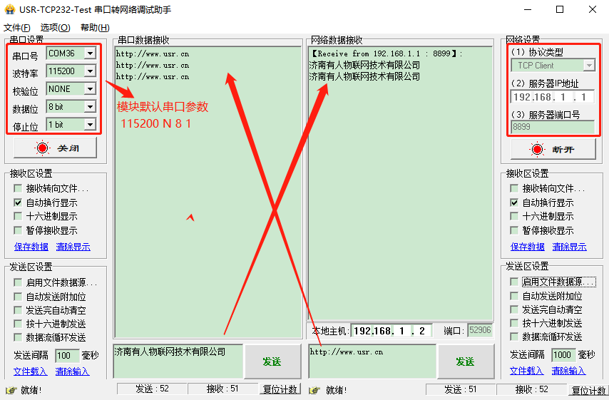 将模块串口连接到电脑的串口,电脑的串口号为com36,电脑连接WiFi模块的IP192.168.1.1,控制端口为8899.由于WiFi模块默认为TCP server,所以电脑端连接模块需要设置为TCP client连接模块的server。