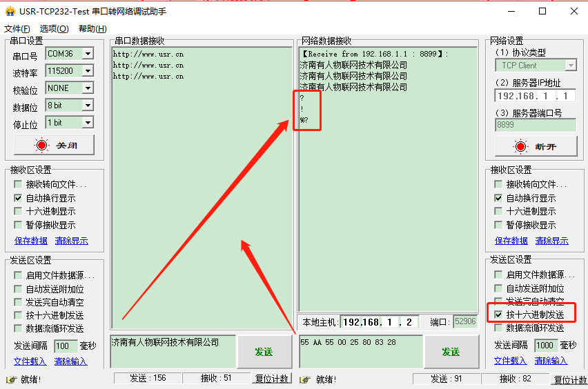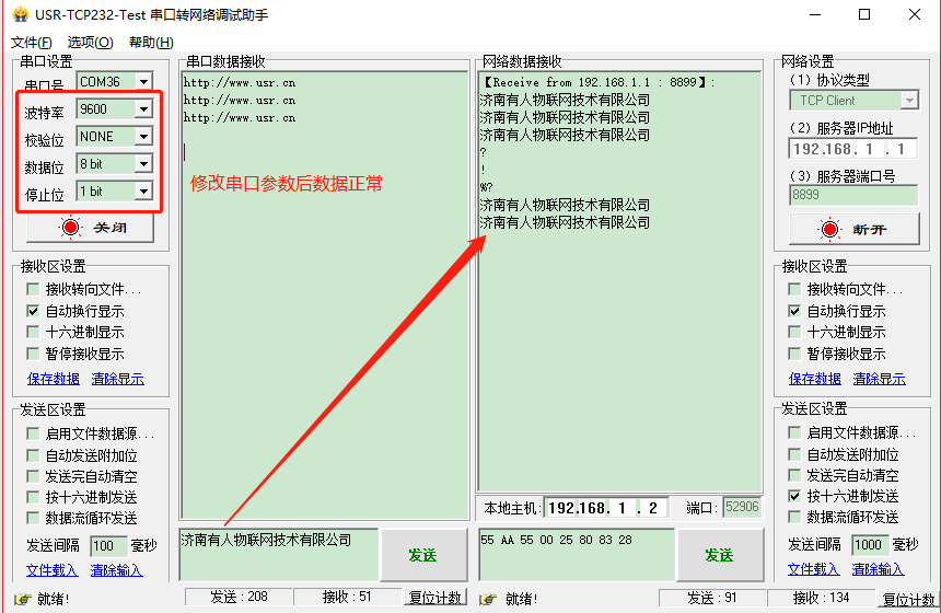 将模块串口参数修改为9600、NONE、8、1, 需要网网络端按十六进制下发55 AA 55 00 25 80 83 28, 发送完成后,软件打开串口需要修改为9600、none、8、1, 不然数据会显示为乱码。 注意:本命令所作的修改立即生效,不需要重启,当次有效,不会保存,断电丢失。