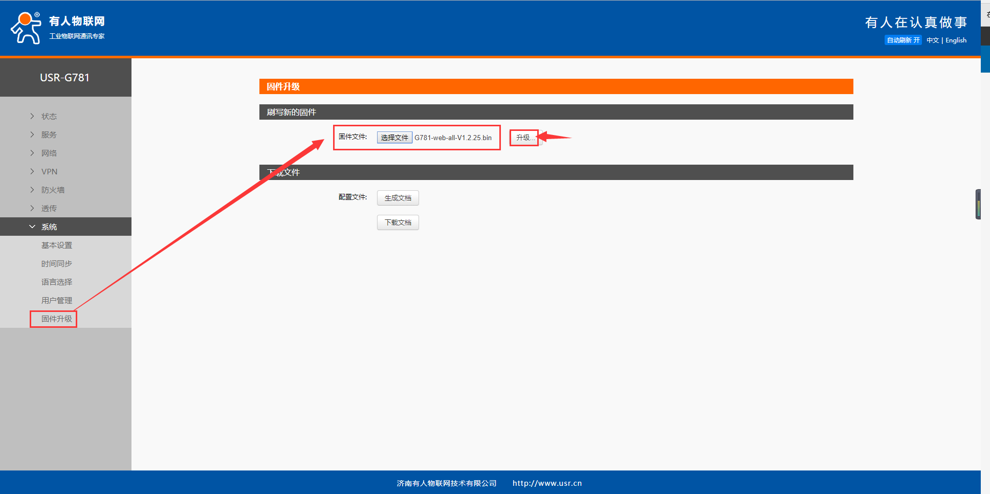 4、 进入系统----固件升级界面,选择对应的固件文件(请登录http://h.usr.cn/提交工单并备注当前固件版本和邮箱地址,技术支持会将固件文件发送至您的邮箱),点击升级,会提示正在升级。此时不要重启设备,不要断电,耐心等待约一分钟左右。设备升级固件完成后会自动重启(可观察指示灯)。