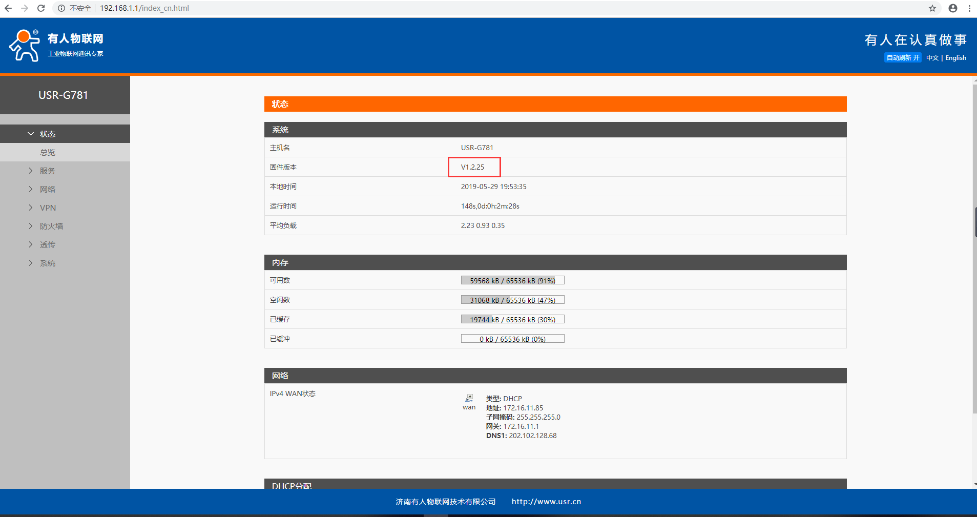 5、 等待设备升级固件完毕自动重启完成后,重新进入配置网页,可在状态总览页面查看到固件版本已经更改