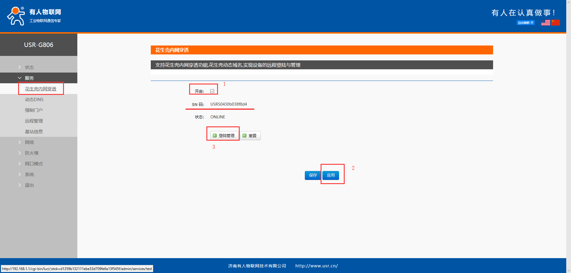 1、 启用花生壳内网穿透功能。勾选开启,点击应用,等待数秒应用完成后重启设备,状态会显示ONLINE,即成功开启
