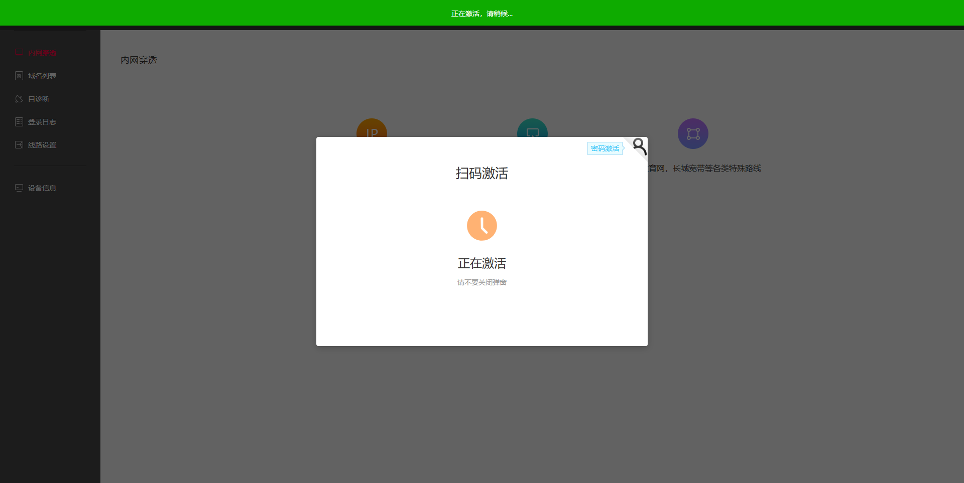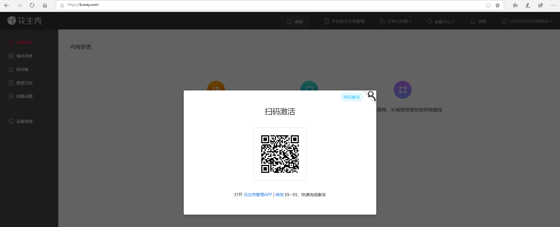 3、进入页面后显示扫码激活。可以用手机花生壳APP扫描二维码激活或者点击右上角,切换激活方式。
