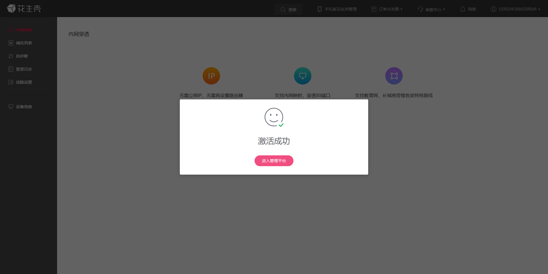 手机端确认激活后,显示激活成功,点击进入管理平台。