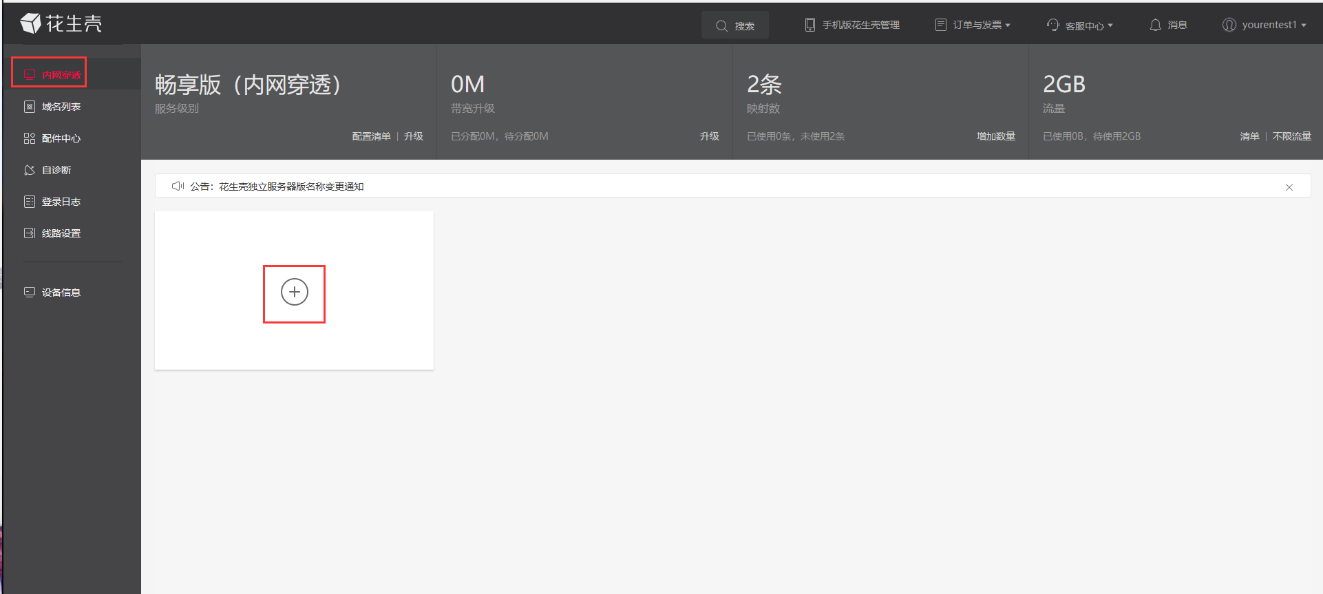 4、左侧导航栏点击进入花生壳内网穿透,点击页面上的+,进入配置。(默认免费版本一个账号可以免费设置两个内网穿透。)