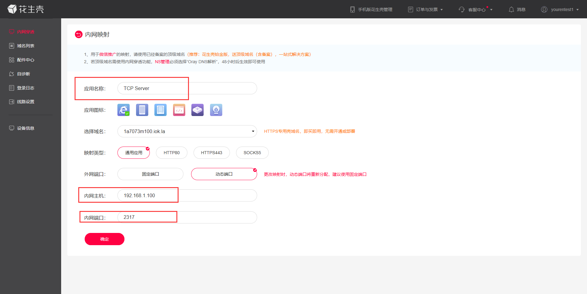 5、应用名称可以自定义,以便于自己区分。应用图标、应用域名、映射类型、外网端口可以根据自己需求来选择,有些选项是收费的。(具体收费细则可咨询花生壳的相关销售和技术,本功能是第三方应用,我司不对其进行收费等业务办理。)在这里如下设置。内网主机填写路由器的LAN口内网设备的IP地址,端口是内网设备的监听端口.设置完成后点击确定。
