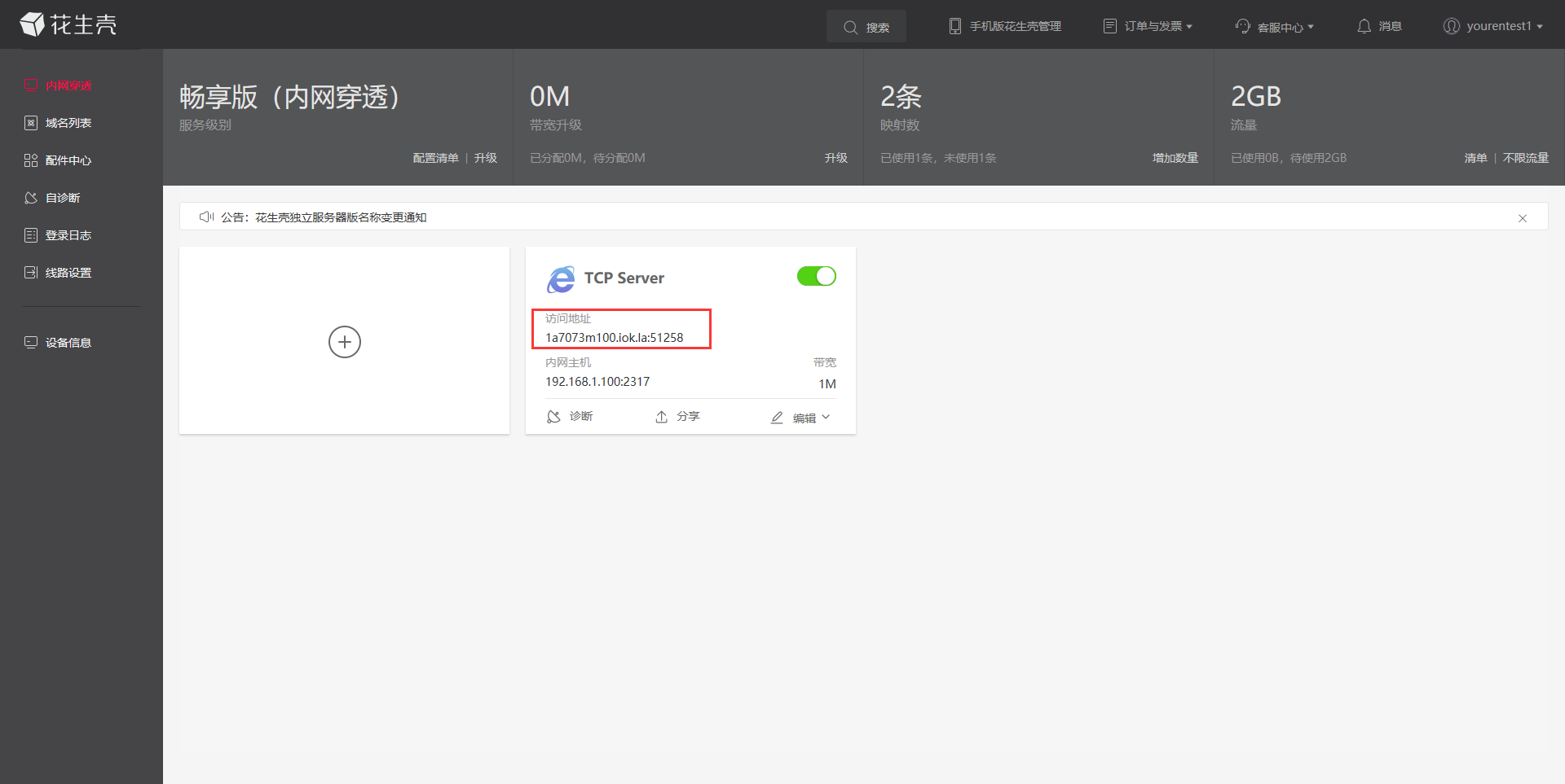 点击确定后跳转页面,生成一路内网穿透,会显示访问地址,即外网访问地址。如下所示:外网域名地址为:1a7073m100.iok.la,外网端口为:51258