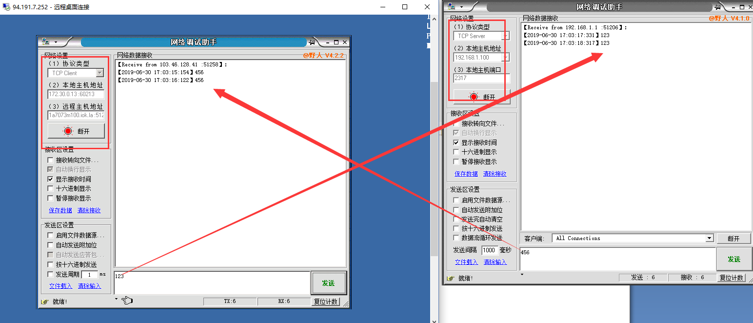 在可访问公网的PC打开网络调试助手,输入映射的地址和端口并点击连接,如下所示,建立连接,并可以双向数据通信