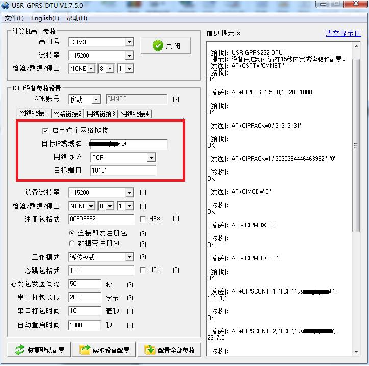 8、 设置DTU目的地址和端口号: