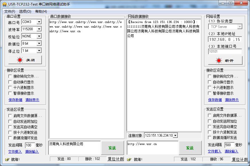 9、 通过调试助手建立TCPSERVER,串口和网络端分别发送数据来测试: