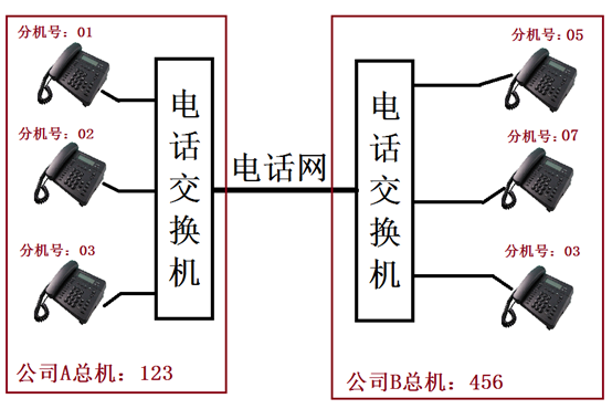 如果他直接拨打分机号03,那么只能把电话打到A公司的03分机,而无法把电话打到B公司。