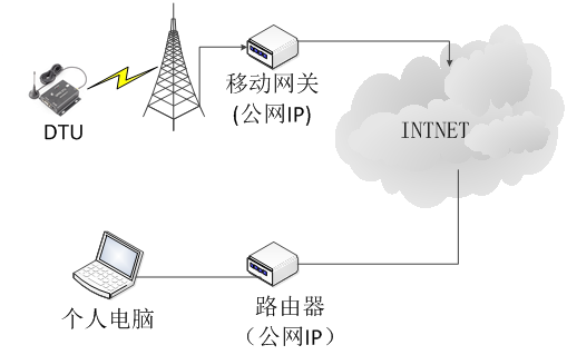 如果网络用户通过运营商获得的IP不是公网IP,那就相当于在分机号码下面再接分机,DTU就无能为力了,这时用户的电脑在网络里隐藏的太深,DTU已经无法找到它了,只能让用户的电脑连接一个有公网IP的服务器,告诉服务器它的具体号码,DTU也把数据发到服务器,由服务器来做一个数据转发了。