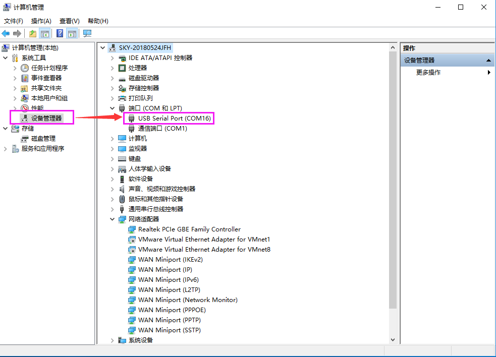 在设备管理器中查看端口信息,确定410S串口使用的串口号,如下图所示电脑端口号为COM16。