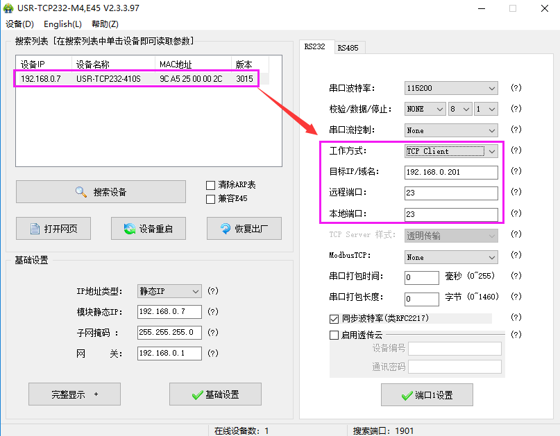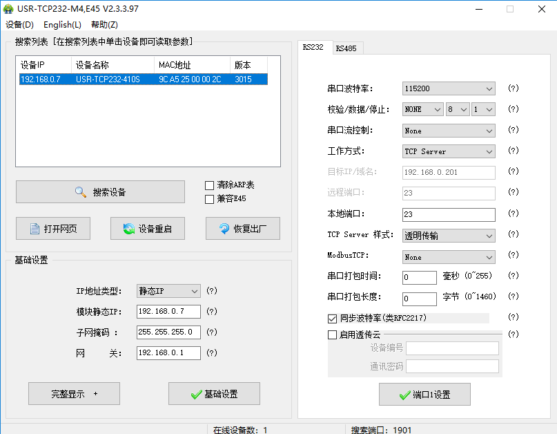 点击“搜索设备”,当搜索列表中出现410S的设备后,单击搜索到的设备,查看其配置信息(下图为默认配置信息)。
