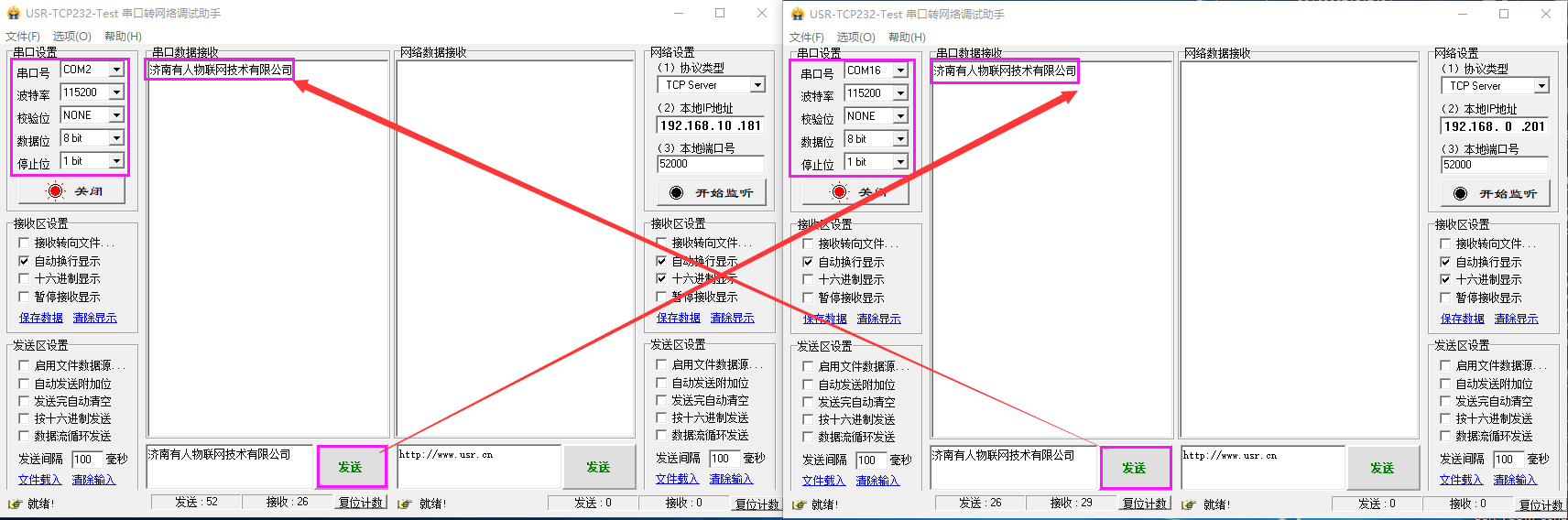 同时打开两个串口转网络助手软件。一个选择虚拟串口,一个选择COM16,即可进行收发测试。