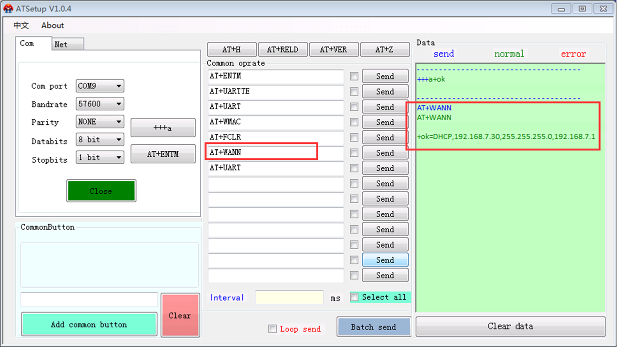 2>发送AT+WANN就可以查询wifi模块的WAN IP地址了;通过这个软件也可以设置/查询wifi模块的其他参数,全面的AT指令见相关产品的软件设计手册。