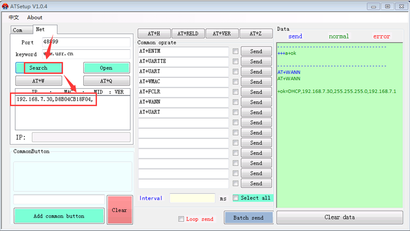 安装上述软件的PC和wifi模块接到同一个路由器下,打开Net选项卡,点击search,能够搜索到wifi模块的IP以及MAC信息的,见下图