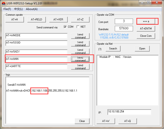3、串口发送AT指令获取模块IP。