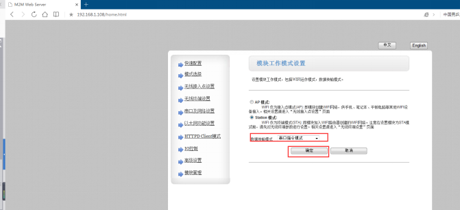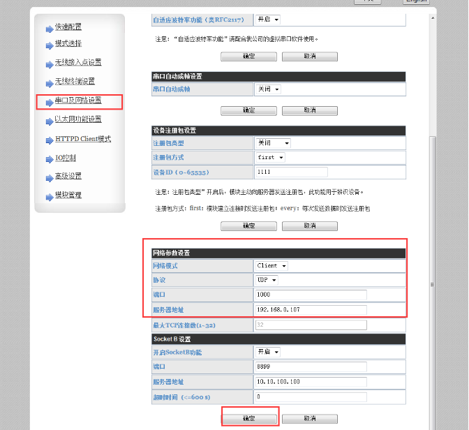 4、登录设置网页,设置为串口指令模式,点击确定;串口及网络设置,设置成UDP Client,目标IP192.168.0.107,目标端口1000。模块管理,重启。