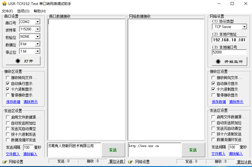 同时打开两个串口转网络助手软件。一个选择虚拟串口,一个选择COM9,即可进行收发测试