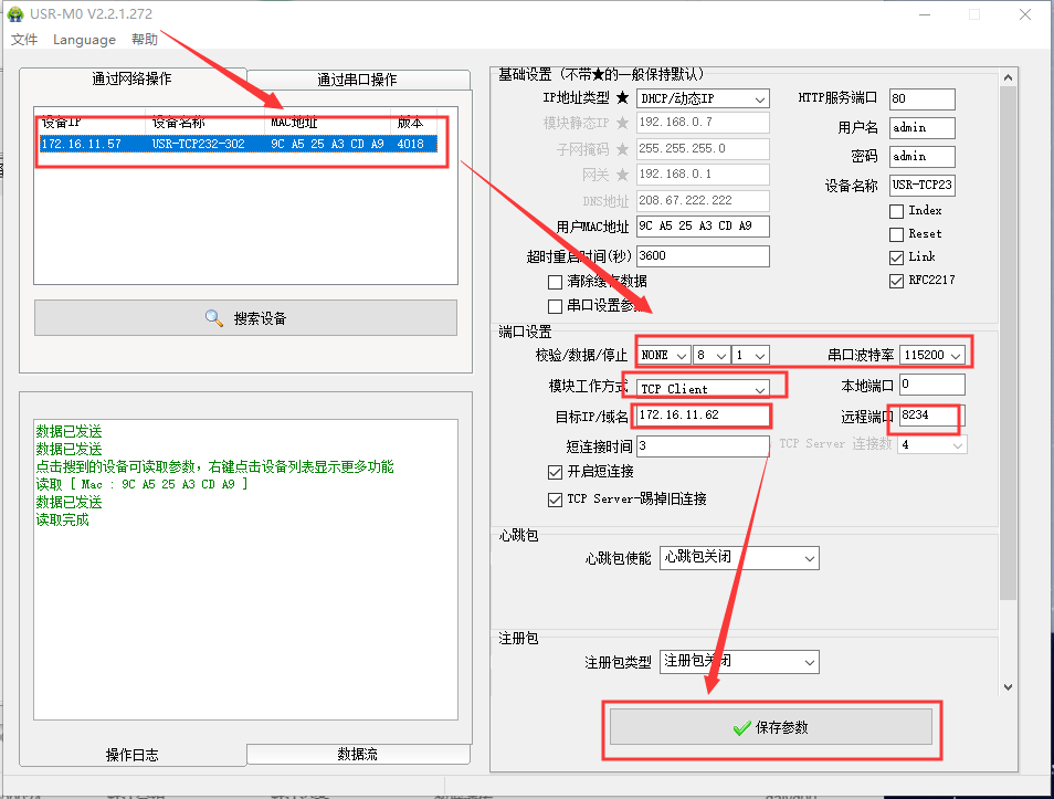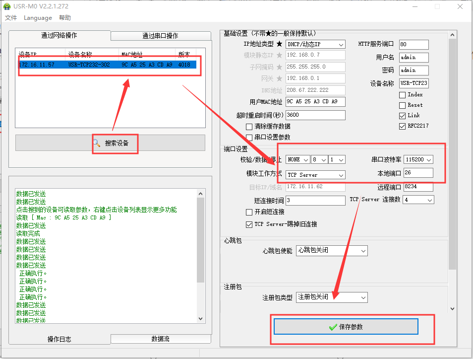 点击“搜索设备”,当搜索列表中出现302的设备后,单击搜索到的设备,设置配置信息并保存