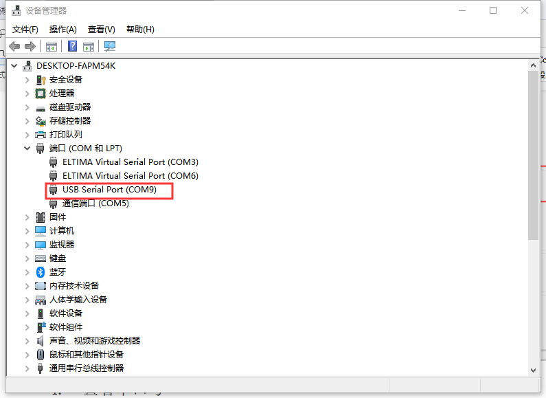 在设备管理器中查看端口信息,确定302串口使用的串口号,如下图所示电脑端口号为COM9