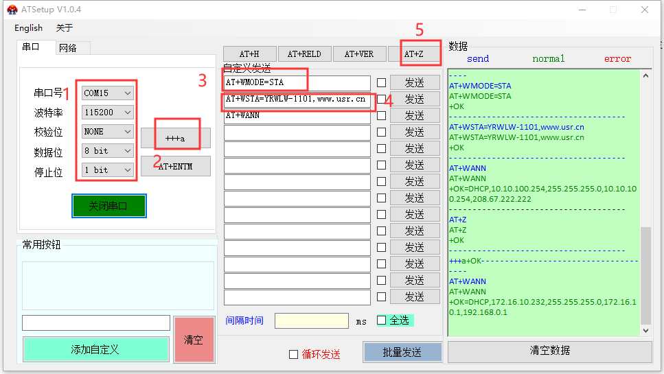 设置串口参数,115200,N,8,1, 打开串口,按照下面步骤设置,设置为STA模式:AT+WMODE=STA,连接路由器WiFi:AT+WSTA=(WiFi名称),(WiFi密码),设置完成后AT+Z重启生效。