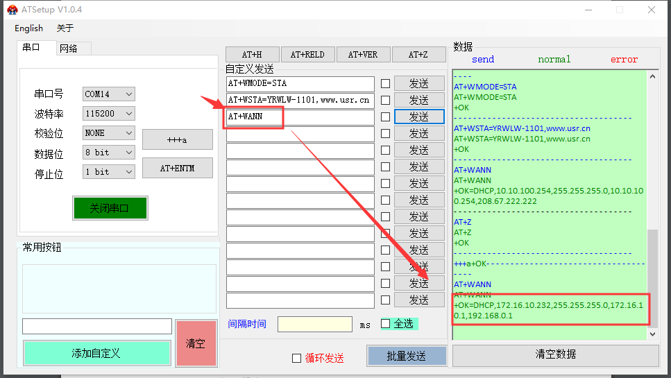2.使用AT指令:AT+WANN查询路由器动态分配给设备的IP
