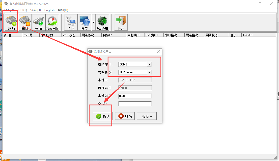 3.创建虚拟串口,网络协议选择TCP Server,本地端口设为8234(可随意设置,只要你设置的端口不是特殊端口或者重复的端口)