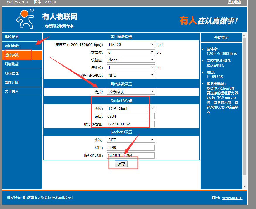 4.按照路由器动态分配给设备的IP:172.16.10.232进入内置网页,配置参数,协议选择TCP client,端口号填虚拟串口的本地端口号8234,服务器地址为虚拟串口的地址172.16.11.62,保存,点击重启设备参数生效。