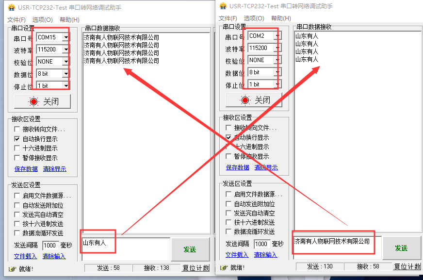 5.同时打开两个串口转网络助手软件。一个选择虚拟串口,一个选择COM15,即可进行收发测试