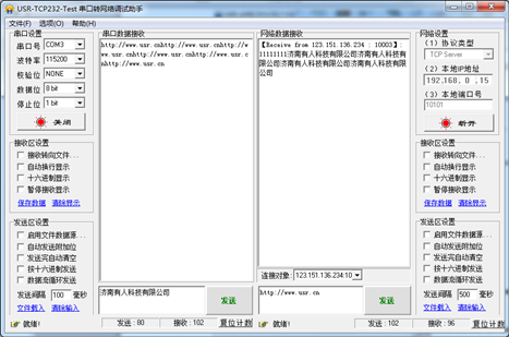 9、通过调试助手建立TCPSERVER,串口和网络端分别发送数据来测试: