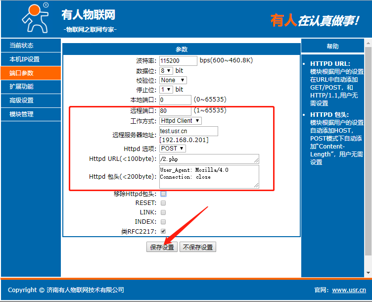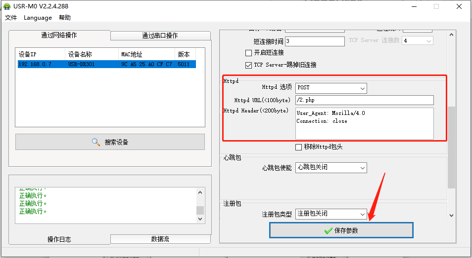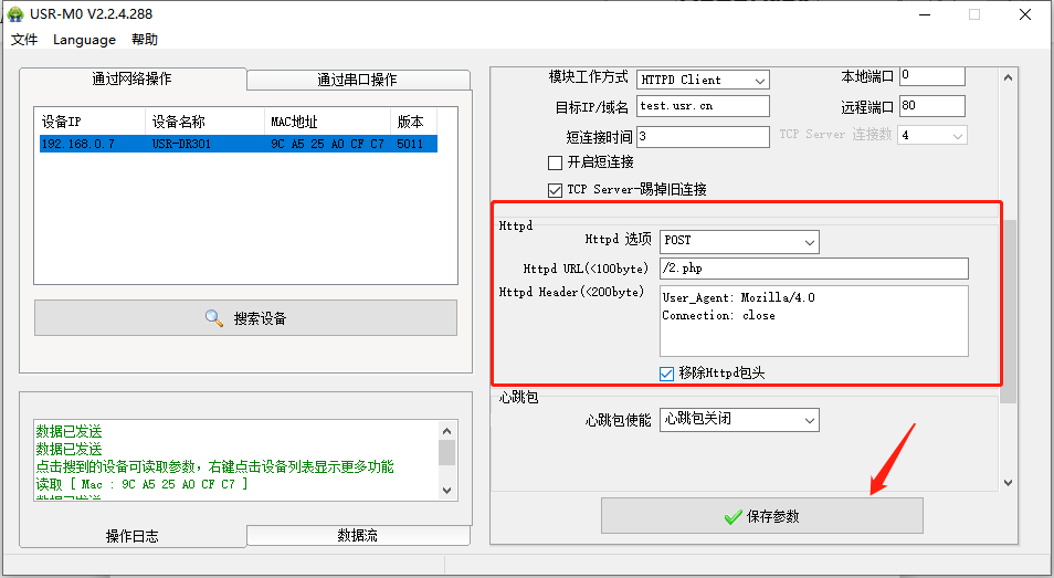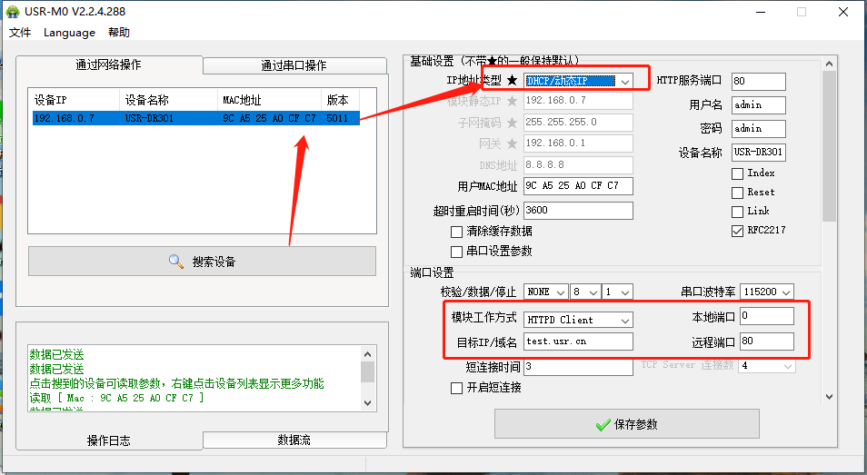 点击“搜索设备”当搜索列表中出现301的设备后,单击搜索到的设备,IP设置为DHCP,模块设置为Httpd Client模式,请求方式POST,URL为/2.php,设置服务器地址test.usr.cn,端口80,设置并保存所有参数,重启模块。(本说明文档使用为有人测试服务器)